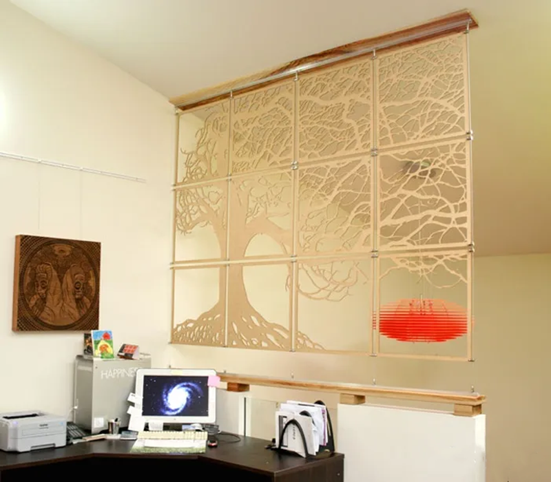 The designer of this work used a laser cutter to carve out the crown and roots of the tree. He uses a rail system with stainless steel wire and clamps to install the screen. This installation method can fix the panel firmly, and it is also convenient to replace at any time.
